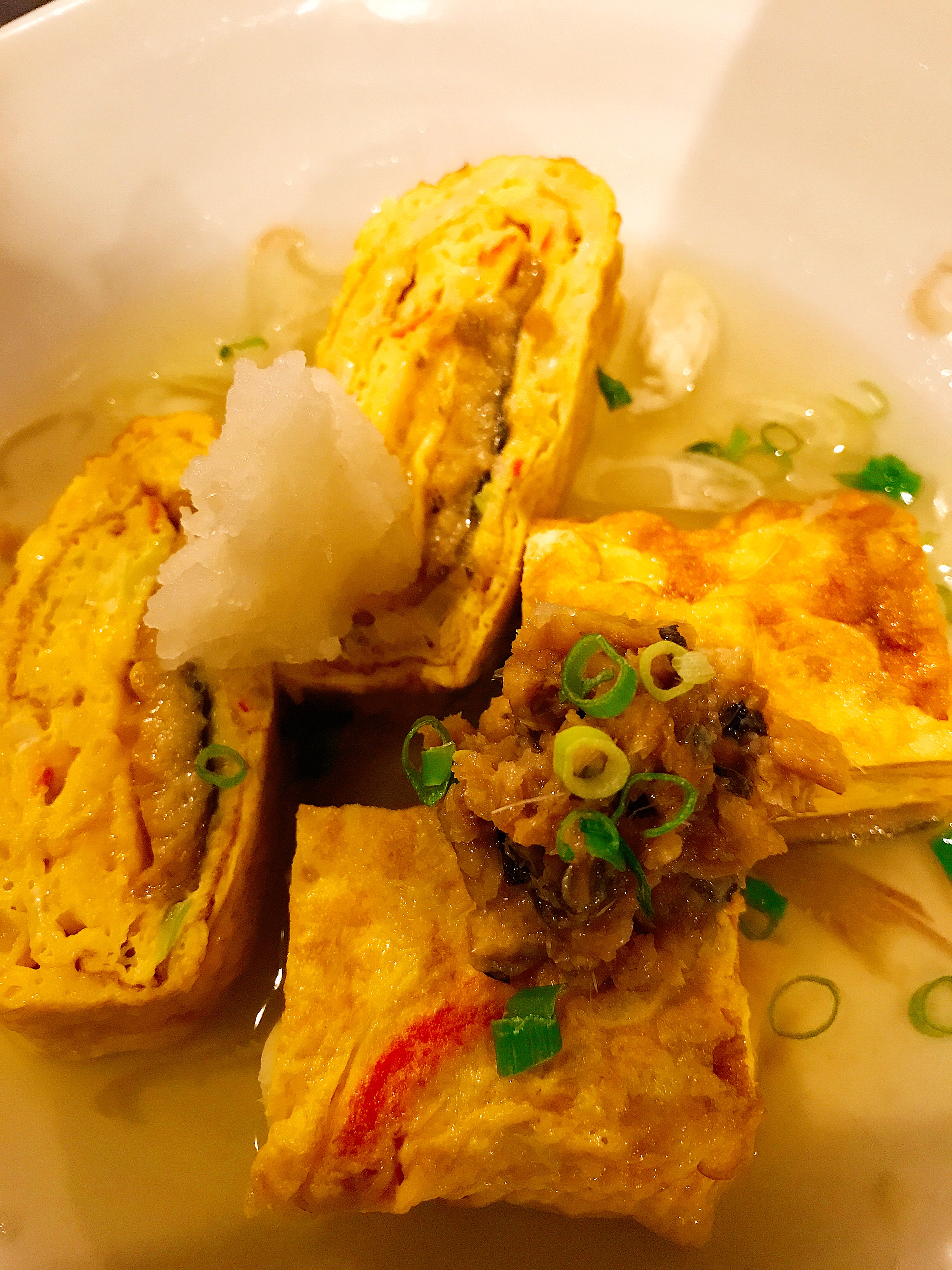 だし巻き卵に鰻を巻く、鰻巻き、いや、すいません、これは鰻ではなく、煮穴子なんですよ!鰻巻きならぬ穴巻き???