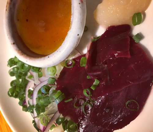 メリハリヤ小作店です! 珍🐟鯨の心臓刺身🐟珍!!! ごま油塩とおろしニンニクで…