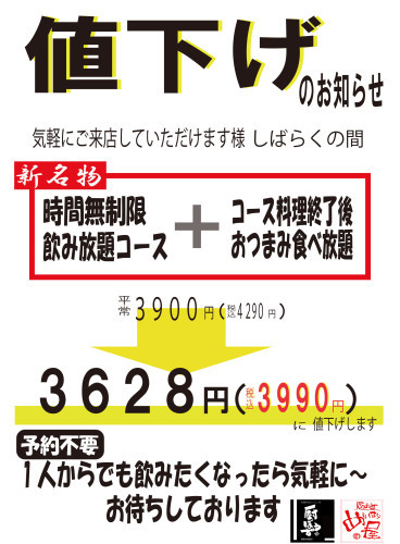 時間無制限飲み放題コース値下げ!